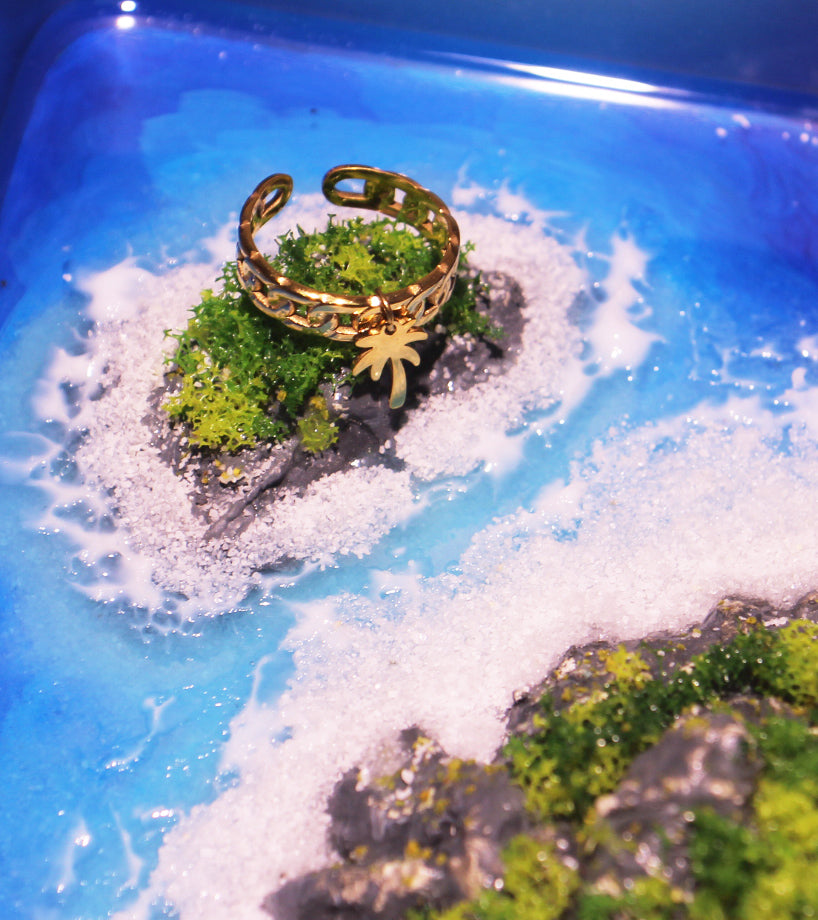 A delicate gold open-ring stands atop a miniature moss-covered island, surrounded by clear resin waves. Its minimalist arc shines like a rising sun over the ocean—a radiant focal point in this tiny landscape. More than an accessory, it’s your personal sanctuary. Wear it as a ritual of returning to yourself.
