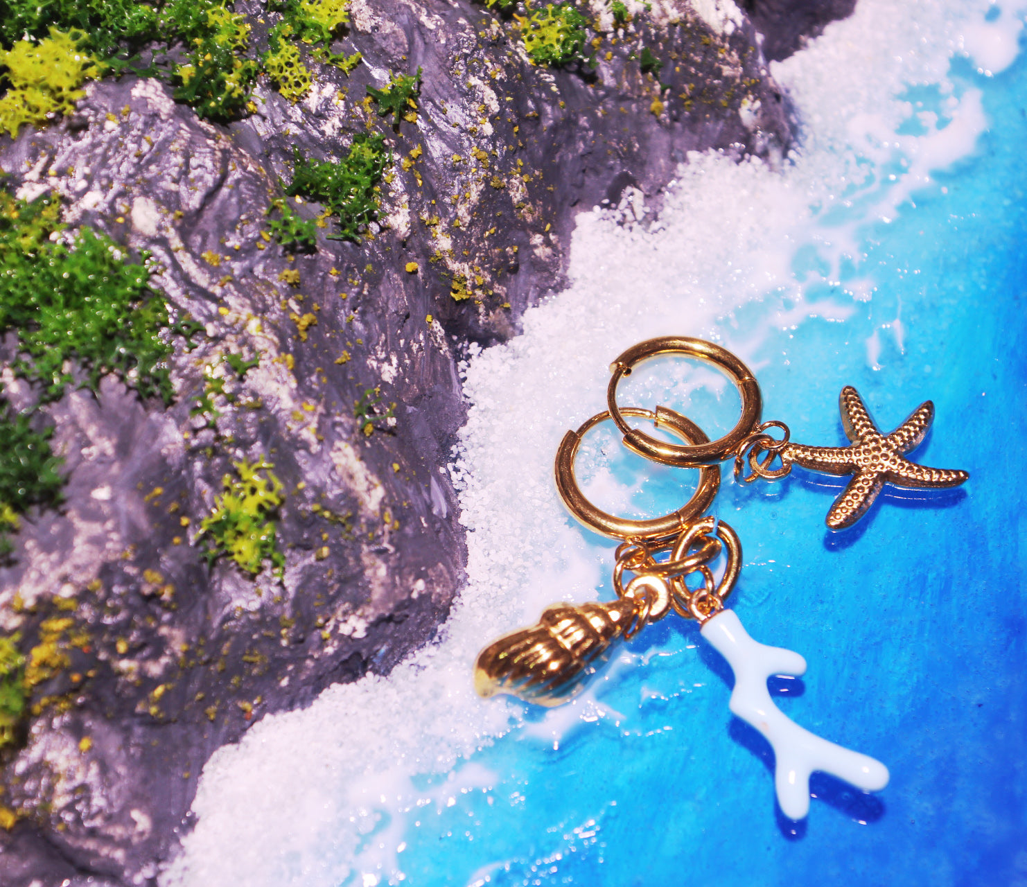 Golden rings and starfish pendants rest peacefully on seaside rocks, against a background of blue-and-white crashing waves. The accessories shine brightly in the lower left, creating a warm and eye-catching contrast with the cool-toned sea.